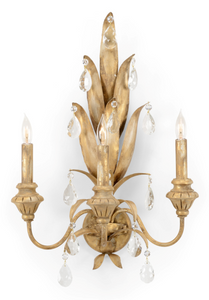 Add task lighting in your home with franklin sconce. This three candle light wall sconce is made of antique gold finished iron and is adorned with teardrop crystals. The light shines off of the warm gold finish and is refracted through the clear crystals sending sparkling light throughout your space. This elegant wall sconce is ideal for any formal room in your home.Read More