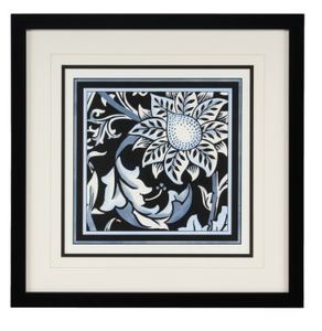 This Floral Motif II features a blue and white floral with black frame and glass.Read More