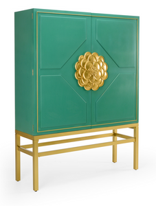 Glitzy traditional style bar cabinet offering shelving for glasses, horizontal wine storage, and a drawer for storage - all wrapped up in a beautiful floral bauble. Not intended for clothing storage. Interior lighting. Designed by Shayla Copas.Read More