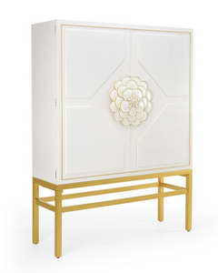 Glitzy traditional style bar cabinet offering shelving for glasses, horizontal wine storage, and a drawer for storage - all wrapped up in a beautiful floral bauble. Not intended for clothing storage. Interior lighting. Designed by Shayla Copas.Read More