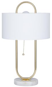 The oval accent lamp for living room boasts a white shade with a polished gold metal body attached to a white marble base. Its standout features include a round shade, an oblong hoop body, and a pull-type switch that adds functionality to this metal accent lamp.