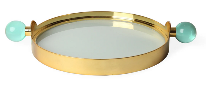 Corral your prized possessions in an eye-catching gem. Featuring a back-painted tempered glass tray set in a polished brass frame punctuated by two luminous celadon acrylic globes for handles. A glamorous addition anywhere from bartop to besides.Read More