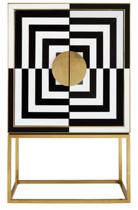 A limited-quantity edition, our modernist and mind-bending cabinet features glass panes reverse-painted in charcoal and ivory with polished brass details. Grooved, split-circle door pulls add a glam spin. Fitted with adjustable tempered glass shelves, plus six wire-bound drinking glass shelves inside the doors. Two drawers at the base keep your mixing accoutrements at hand.Read More