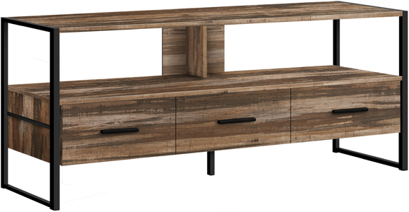 Bring industrial-inspired style to your entertainment space with this low-profile open back tv stand. The bold design starts with strong black satin metal supports at each end and in the center, and with a sturdy 49.25" long shelving that can hold any size TV once centered. Finished in a rustic brown reclaimed wood-look, this entertainment console features a long open shelf for media storage equipment or a sound bar.Read More